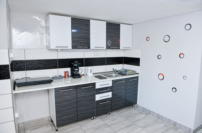Teljesen felszerelt konyha: hűtőszekrény, főzőlap, mikrohullámú sütő, vízforraló, edények